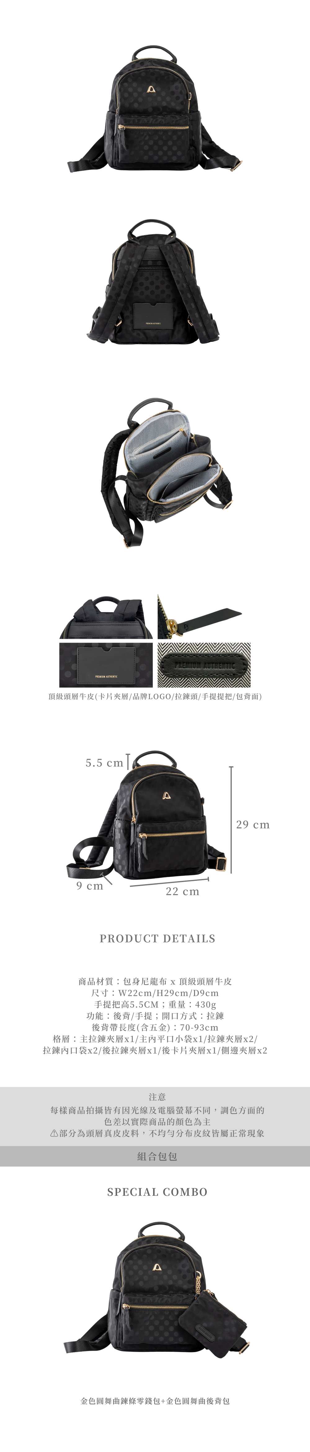 格層:主拉鍊夾層x1/主內平口小袋x1/拉鍊夾層x2/拉鍊內口袋x2/後拉鍊夾層x1/後卡片夾層x1/側邊夾層x2