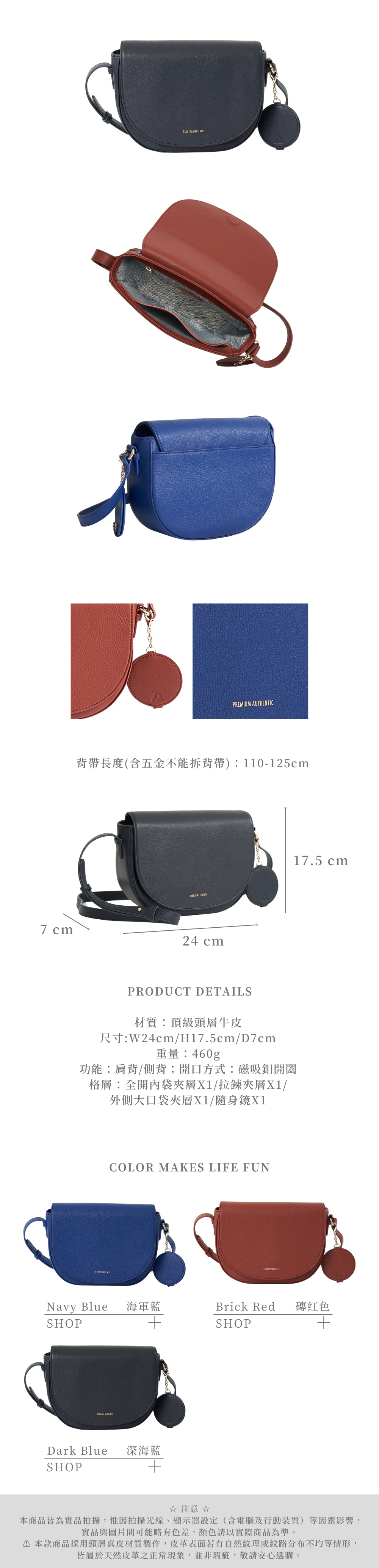 格層:全開內袋夾層X1/拉鍊夾層X1/外側大口袋夾層X1/隨身鏡X1