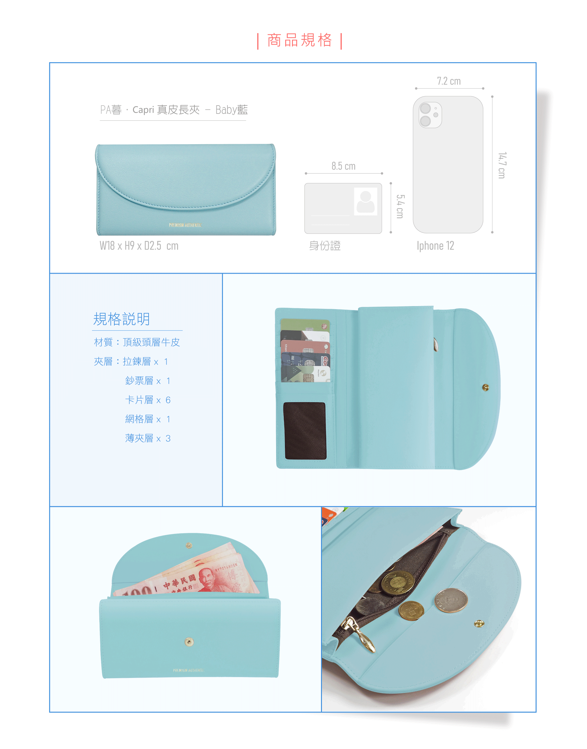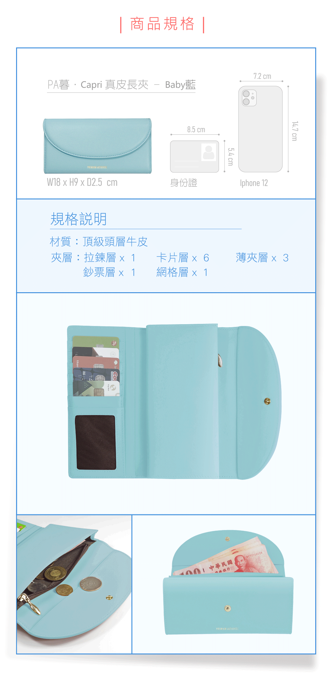格層:拉鍊層x1/鈔票層x1/卡片層x6/網格層x1/薄夾層x3