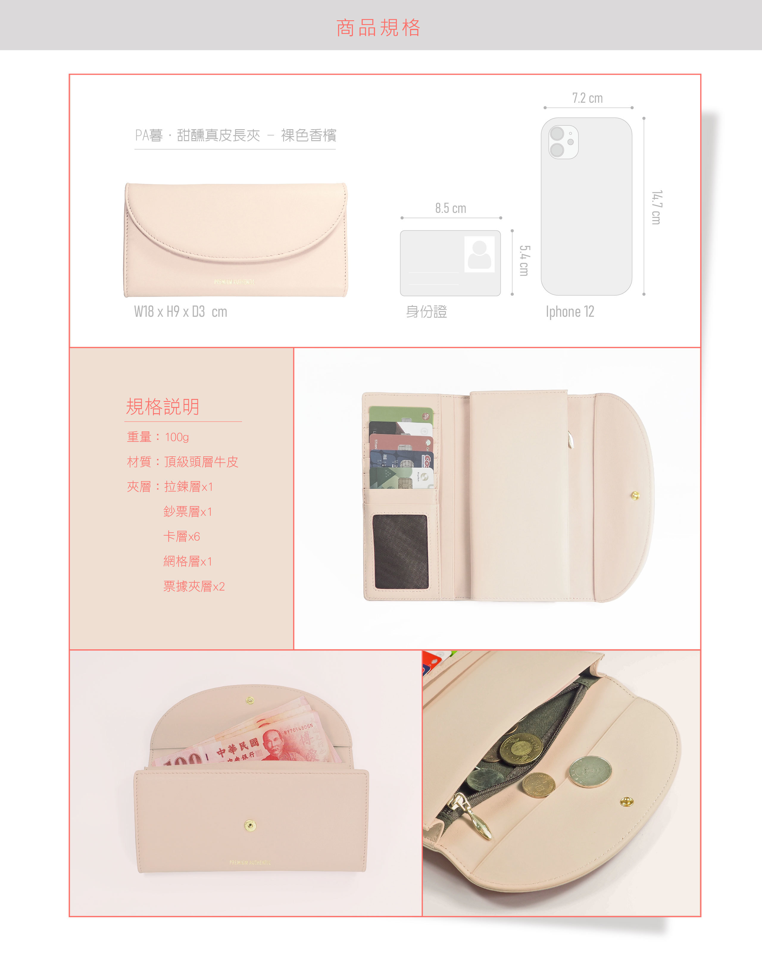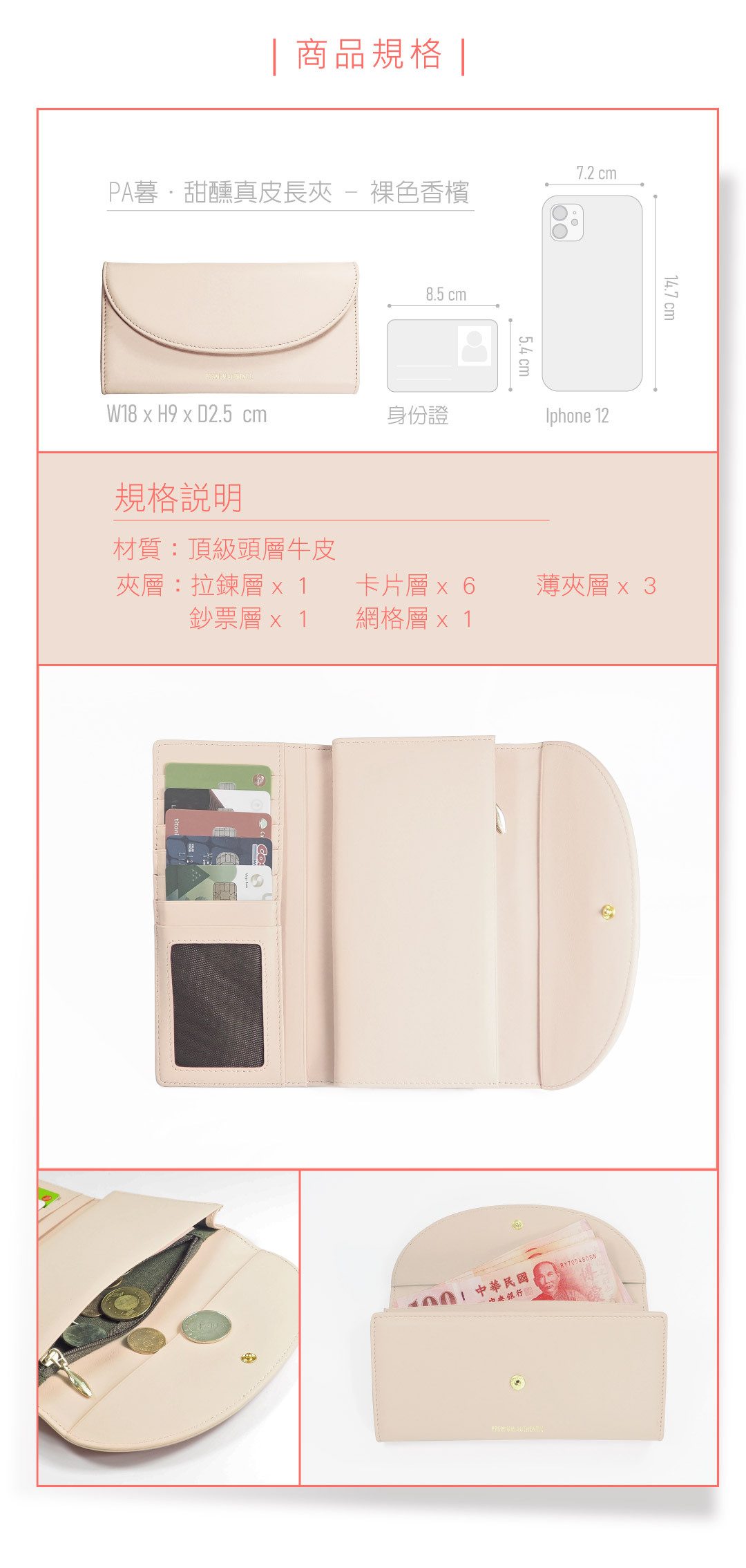格層:拉鍊層x1/鈔票層x1/卡片層x6/網格層x1/薄夾層x3