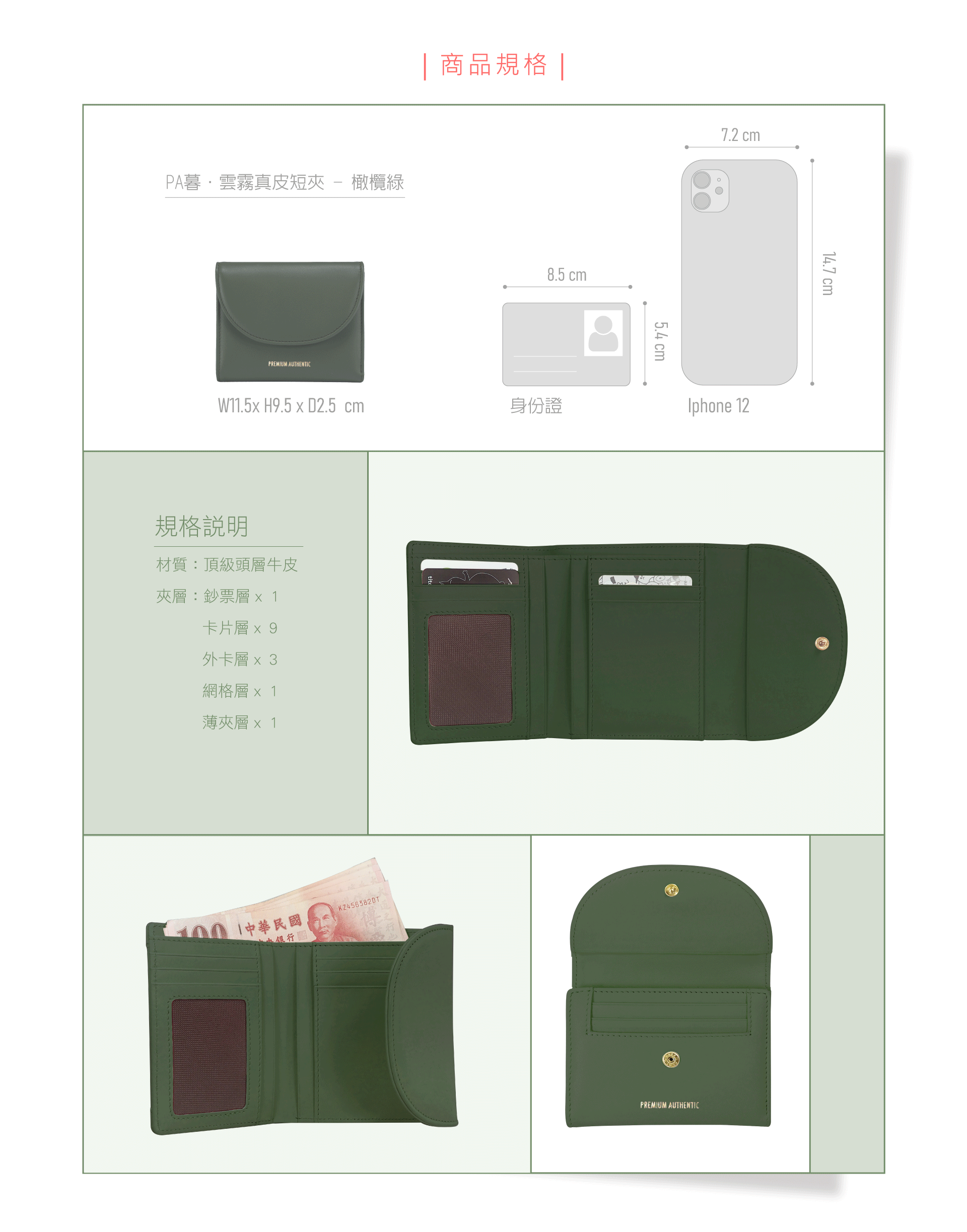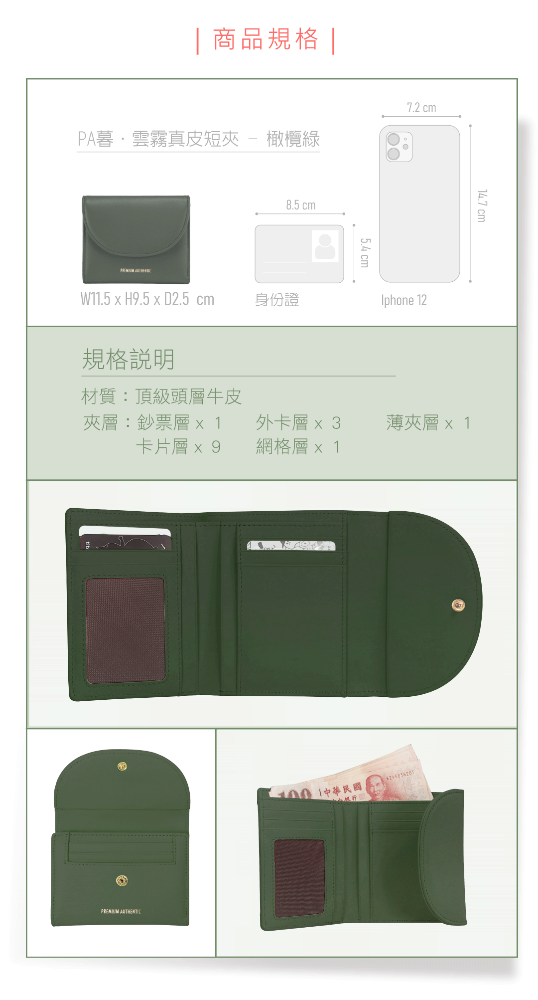 [寶成員購]PA暮.雲霧真皮短夾-橄欖綠