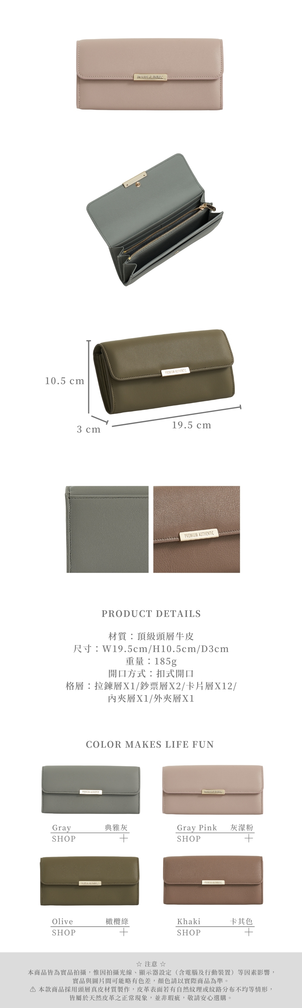 格層:拉鍊層x1/鈔票層x2/卡片層x12/內夾層x1/外夾層x1