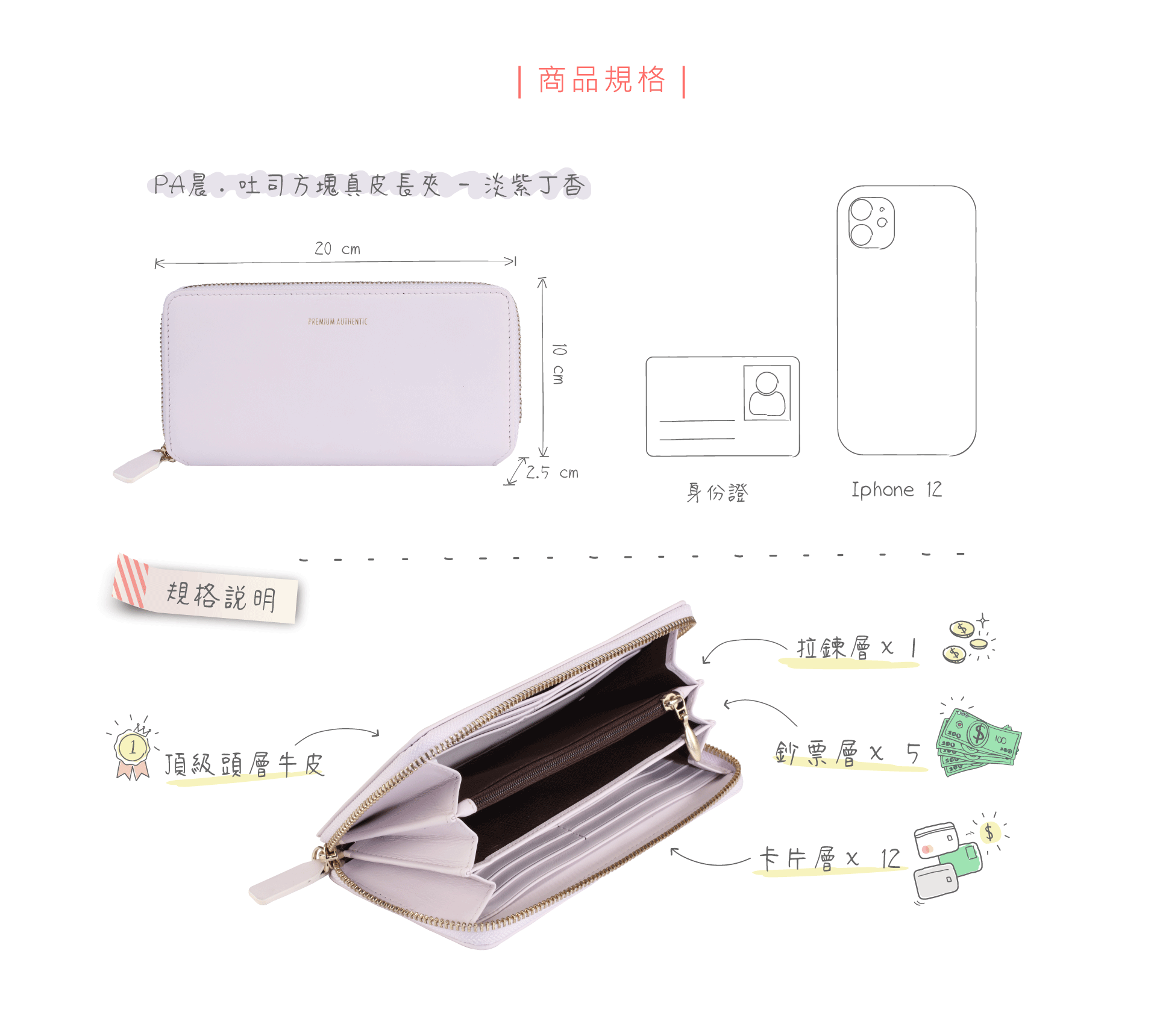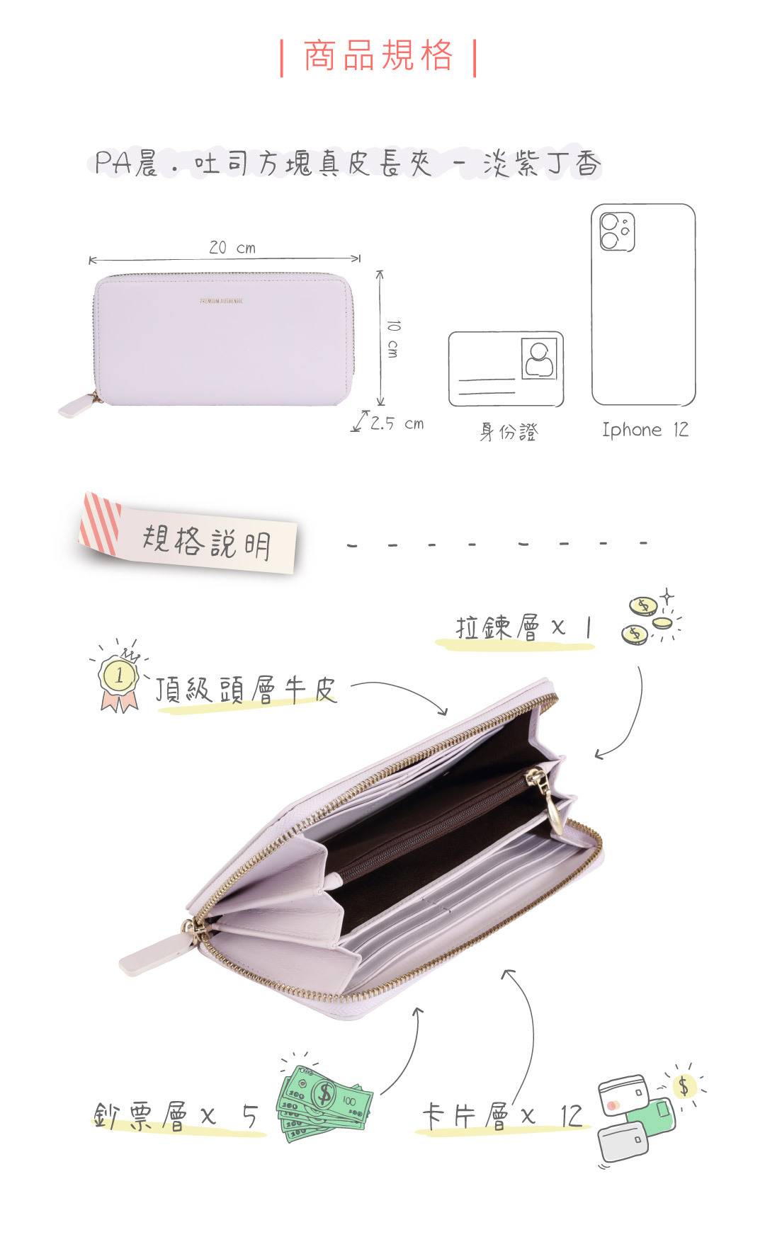 格層:拉鍊層x1/鈔票層x5/卡片層x12